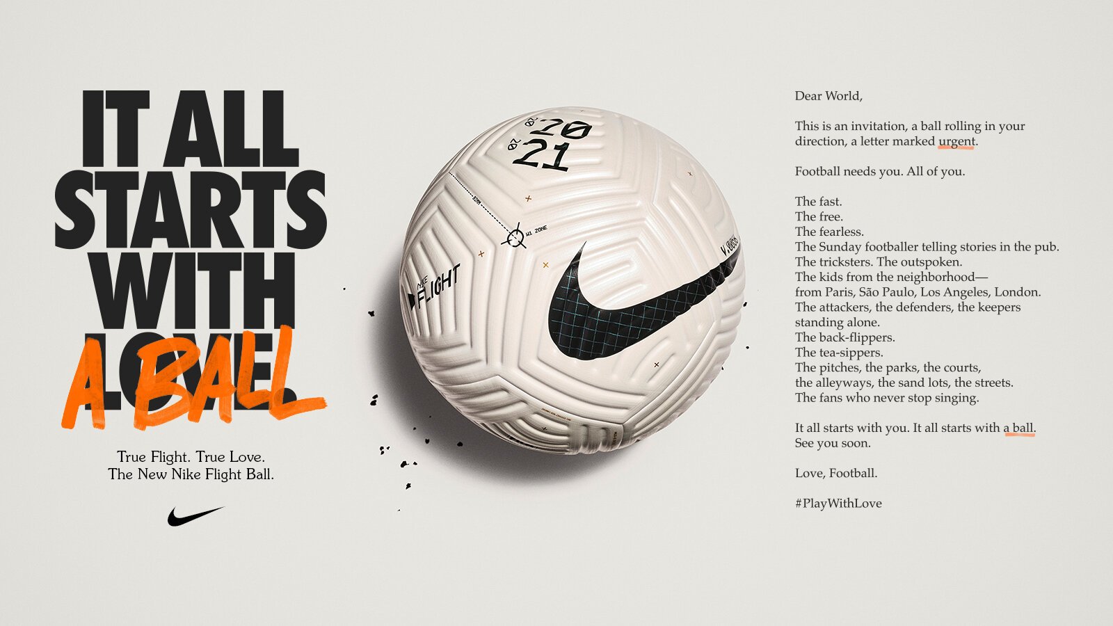 I also designed the launch graphic for the Nike Flight Ball. My goal was to ensure that nothing would distract from the beautiful grooved channels of the new design. I wanted the ball to have a timeless aesthetic that felt both classic & futuristic simultaneously. So I kept it mostly white with 2 bold swooshes on either side. I also covered the entire surface of the ball in a subtle, color-changing ink to accentuate the grooved topography. In the right light, this ink highlights the grooves with a vibrant teal blue color. The iridescent ink also turned the entire ball a creamy ivory color that made it feel aged, yet futuristic at the same time; an interesting visual paradox that captivates the eye. Finally, I covered the ball in small technical details that hint at the data-driven nature of its conception.